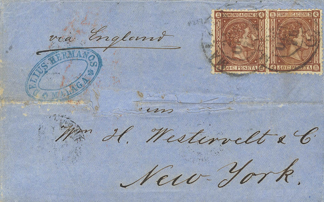 167(2). 1876. 40 cts castaño, dos sellos. MALAGA a NUEVA YORK (U.S.A.), circulada por la vía de Inglaterra (algunas erosiones en el frente). Matasello fechador grande MALAGA / (6). BONITA.
