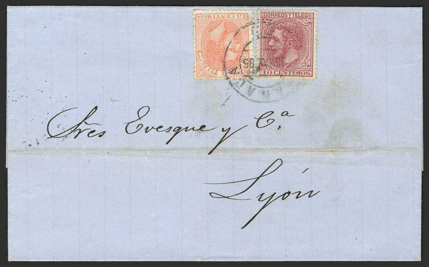 202, 210. 1885. 10 cts. y 15 cts. GRANADA a LYON (FRANCIA). Matasello GRANADA / (15). MAGNIFICA COMBINACION.