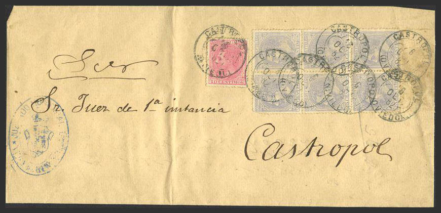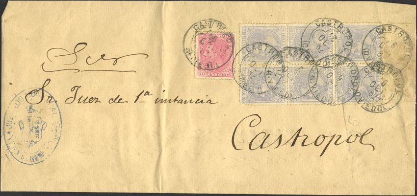 202, 204(6). 1884. 10 cts. y 25 cts., bloque de seis. Plica de Judicial de VEGA DE RIBADEO a CASTROPOL. MAGNIFICA.