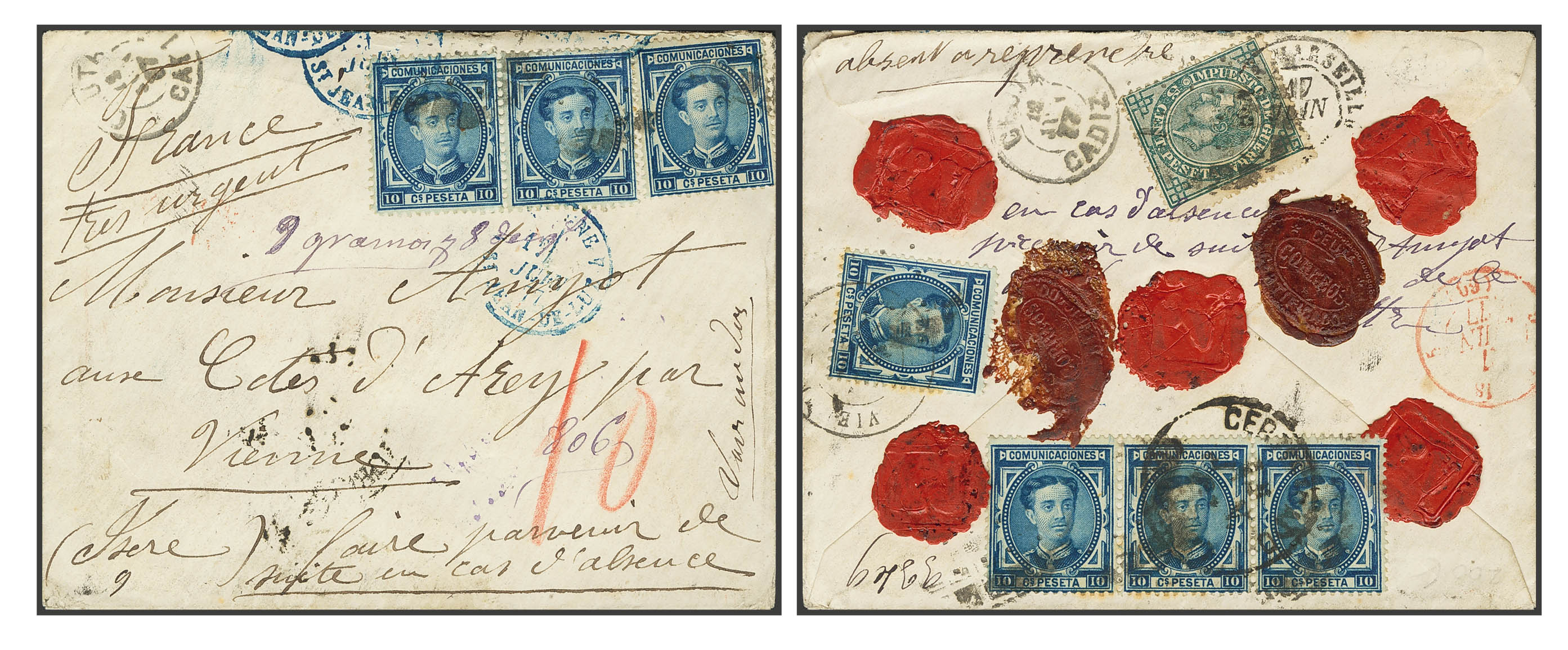 175(7), 183. 1877. 10 cts azul, siete sellos (cuatro al dorso) y 5 cts verde de Impuesto de Guerra (al dorso). Certificado de CEUTA a COTES D´AREY (FRANCIA). Diversas anotaciones manuscritas, al dorso matasello CERTIFICADO / CEUTA, diversos lacres CEUTA / CORREOS / CERTIFICADO. MAGNIFICA Y EXTRAORDINARIAMENTE RARA, ESPECTACULAR COMBINACION DE FRANQUEO PARA COMPLETAR LA TARIFA DE 75 CTS DE CERTIFICADO A FRANCIA, INCLUYENDO UN SELLO DE 5 CTS DE IMPUESTO DE GUERRA QUE FUE USADO POSTALMENTE, MUY PROBABLEMENTE ESTAMOS ANTE LA PIEZA DE HISTORIA POSTAL MAS IMPORTANTE DE LA EMISION, SU ORIGEN EN AFRICA UNIDO A LA ESPECTACULARIDAD DE LA PIEZA HACEN DE ELLA UNA PIEZA DE ENORME RELEVANCIA.