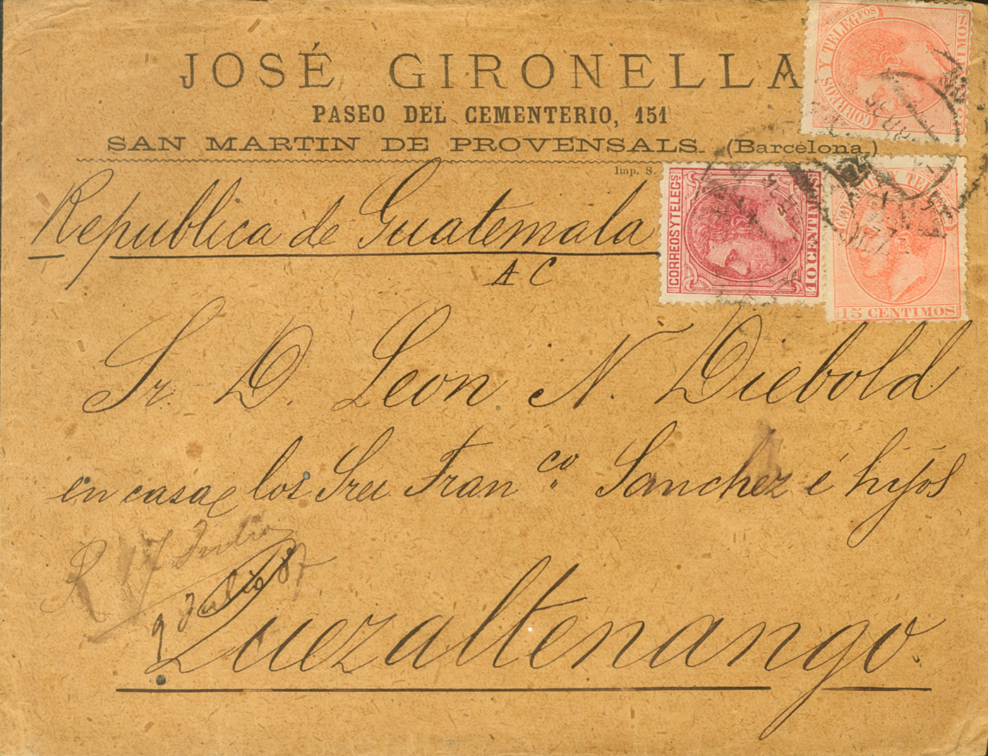 210(2), 202. 1885. 15 cts naranja, dos sellos y 10 cts carmín rosa. SAN MARTIN DE PROVENSALS (BARCELONA) a QUEZALTENANGO (GUATEMALA). MAGNIFICA Y RARISIMO DESTINO.
