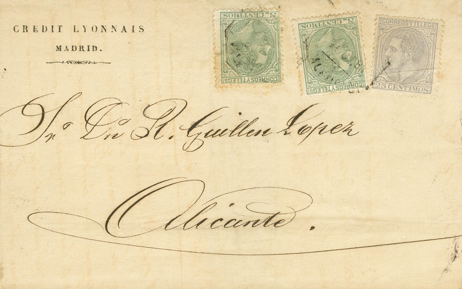 201(2), 204. 1884. 5 cts verde, dos sellos y 25 cts gris azul. MADRID a ALICANTE. MAGNIFICA Y RARO FRANQUEO DE SEGUNDO ALCANCE.