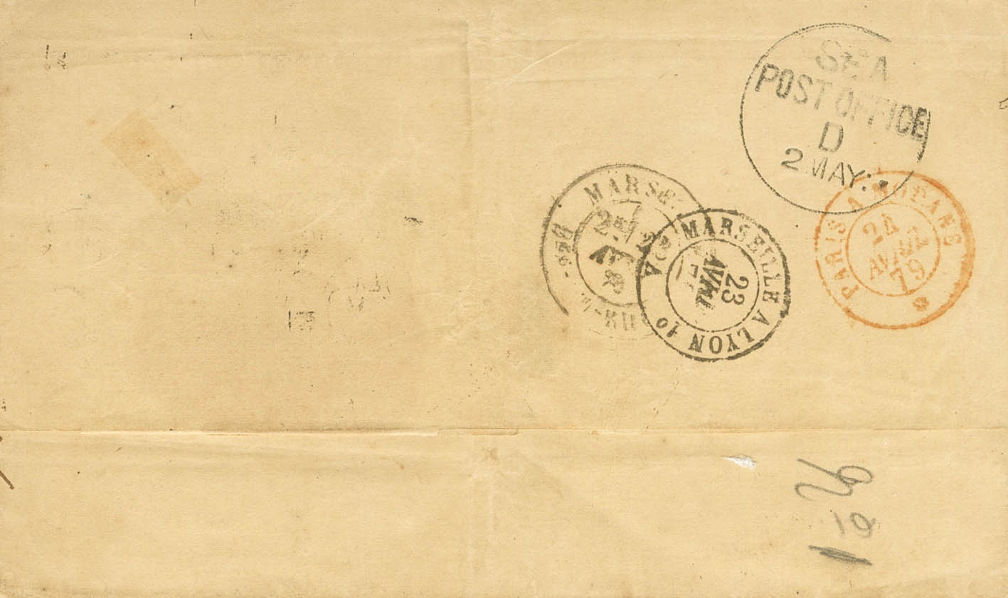 194. 1879. 25 cts sepia oliva. BARCELONA a BOMBAY (INDIA), circulada vÃa Marsella e Inglaterra. Al dorso ambulantes franceses y fechador SEA / POST OFFICE / D. MAGNIFICA Y EXTRAORDINARIAMENTE RARO DESTINO, PROBABLEMENTE SE TRATE DE LA PRIMERA CARTA FILATELICA CIRCULADA A LA INDIA.