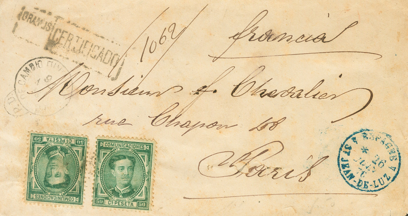 179(2). 1876. 50 cts verde, dos sellos. Certificado de MADRID a PARIS (FRANCIA). En el frente marca GRAMOS / CERTIFICADO y fechador especial P.D. / ESTAFETA DE CAMBIO / MADRID, tarifa de doble porte certificado. MAGNIFICA Y RARA.