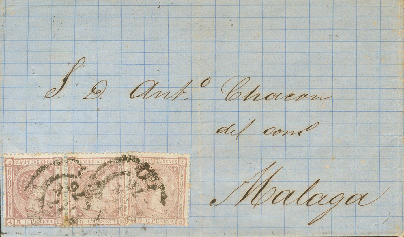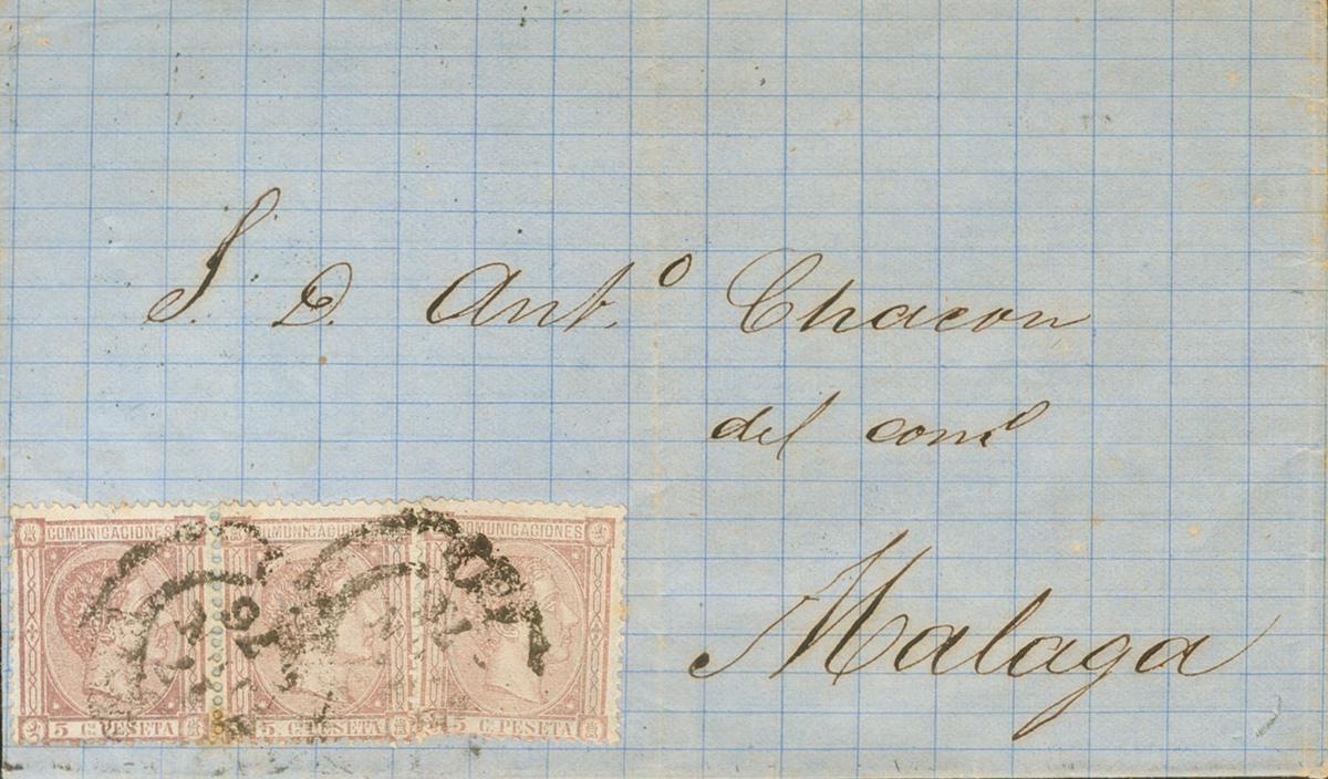163(3). 1875. 5 cts lila, tres sellos. SEVILLA a MALAGA. MAGNIFICA Y RARISIMO FRANQUEO DONDE UN SELLO DE CORREO ORDINARIO SUSTITUYE AL DEL IMPUESTO DE GUERRA