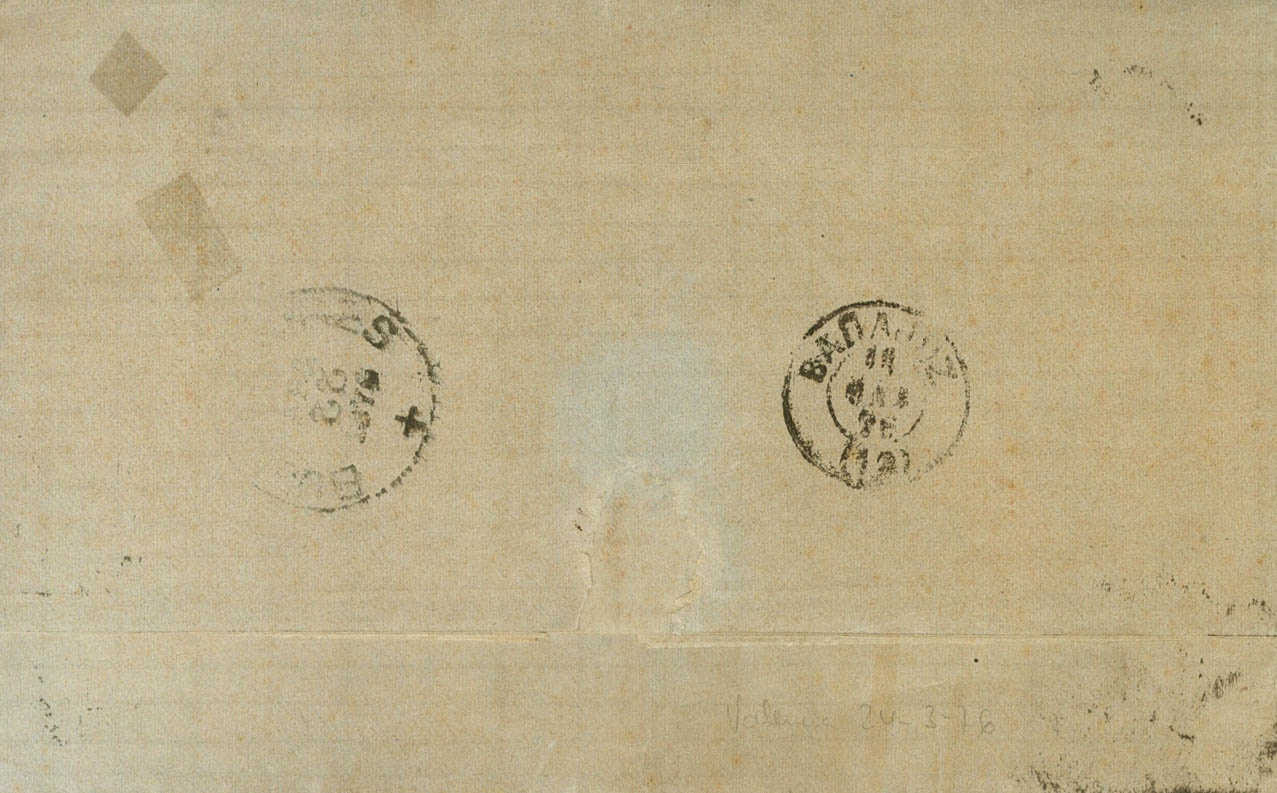 164, 166(3), 154. 1876. 10 cts azul, 25 cts rosa, tres sellos y 5 cts verde de Impuesto de Guerra. VALENCIA a BUENOS AIRES (ARGENTINA), circulada vÃa Portugal cuya tarifa era de 75 cts, por lo que tiene un exceso de franqueo de 15 cts, de los que 5 cts del Impuesto de Guerra no era aplicable, muy probablemente se aplicó el franqueo de 85 cts para circular vÃa Francia o Inglaterra pero finalmente se utilizó la vÃa de Portugal, al dorso tránsito por Badajoz. MAGNIFICA Y RARISIMO FRANQUEO, PIEZA DE ENORME ESPECTACULARIDAD.