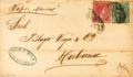 166, 154. 1876. 25 cts rosa y 5 cts verde de Impuesto de Guerra. BARCELONA a LA HABANA (CUBA). Matasello PARRILLA COLONIAL, a la llegada y en el frente manuscrito "Vapor Marial". MAGNIFICA Y MUY RARA.