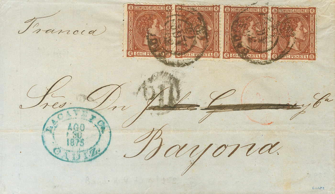 167(4). 1875. 40 cts castaño, tira de cuatro sellos. CADIZ a BAYONA (FRANCIA). Matasello CADIZ / (3). MAGNIFICA Y RARO Y ESPECTACULAR FRANQUEO DE CUATRO PORTES.