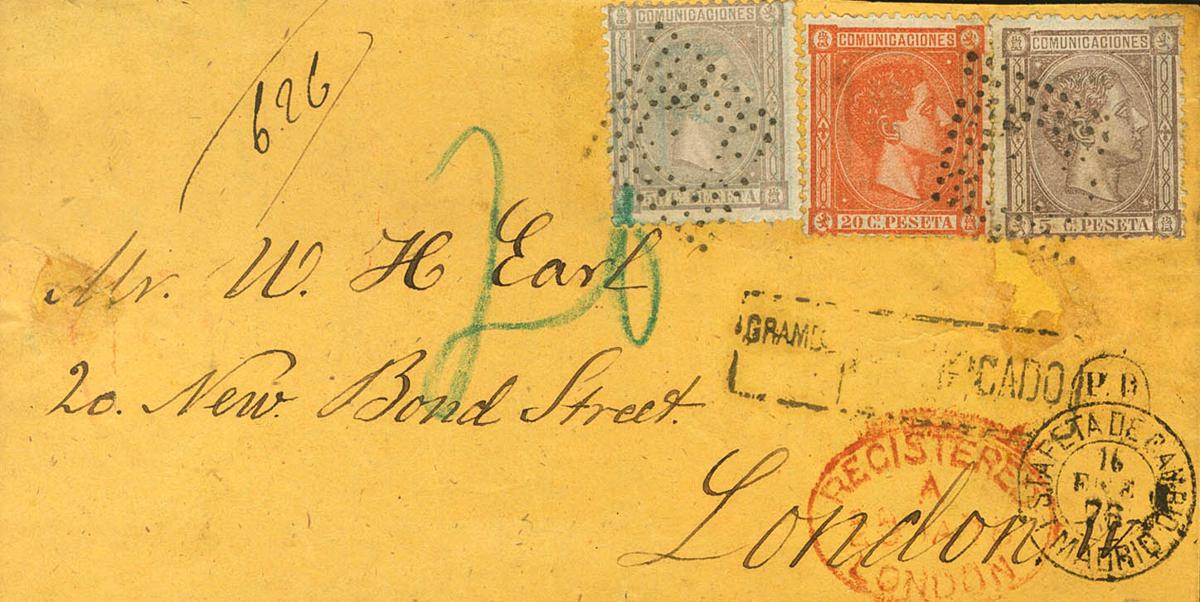 163, 165, 168. 1876. 5 cts lila, 20 cts naranja y 50 cts lila. Frontal de Certificado de MADRID a LONDRES (GRAN BRETAÑA). En el frente marca GRAMOS / CERTIFICADO, fechador especial P.D. / ESTAFETA DE CAMBIO / MADRID y llegada. MAGNIFICA E INUSUAL COMBINACION DE FRANQUEO PARA COMPLETAR LA TARIFA DE PORTE SENCILLO CERTIFICADO A INGLATERRA, LOS CERTIFICADOS EN ESTA EMISION SON MUY RAROS, PIEZA DE ENORME ESPECTACULARIDAD