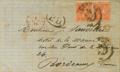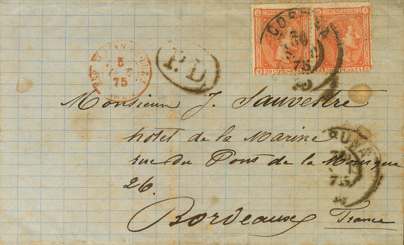 165(2). 1875. 20 cts naranja, pareja. LA CORUÑA a BURDEOS (FRANCIA). Matasello CORUÑA / (4). MAGNIFICA Y RARA COMBINACION DE FRANQUEO.