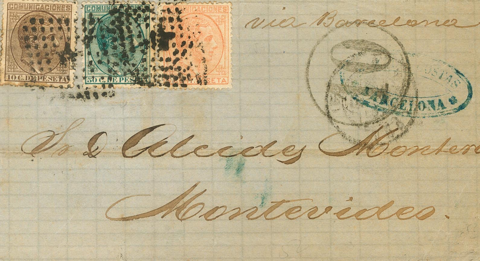 191, 192, 196. 1878. 5 cts naranja, 10 cts castaño y 50 cts verde. Frontal de BARCELONA a MONTEVIDEO (URUGUAY). MAGNFICO.