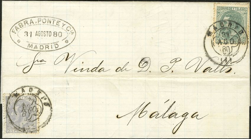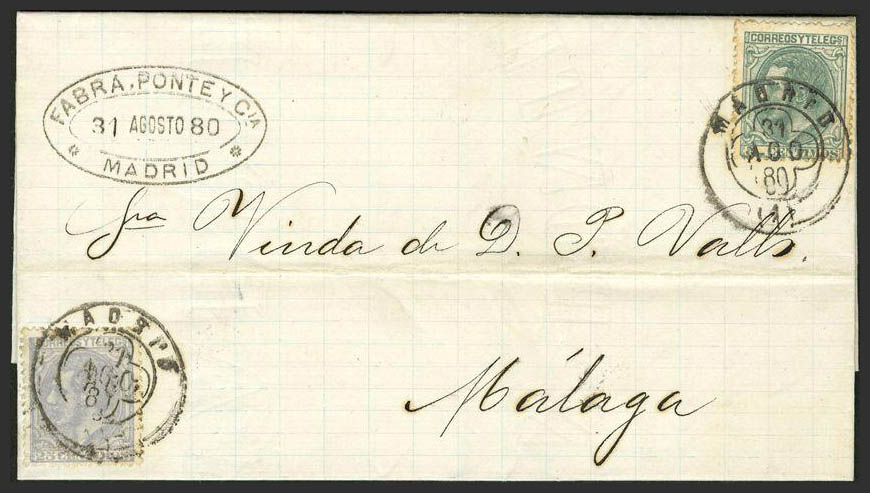 201, 204. 1880. 5 cts. verde y 25 cts. gris. MADRID a MALAGA. MAGNIFICA Y RARA TARIFA DE ALCANCE CON 5 CTS. DE MAS SOBRE LA TARIFA NORMAL.