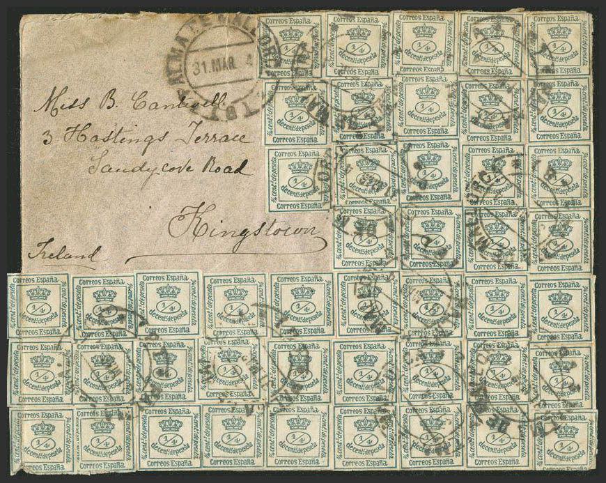 173(25). 1904. 1/4 cuartos, cien sellos en anverso y reverso. PALMA DE MALLORCA a KINGSTOWN. Al dorso llegada. MAGNIFICA Y RARO FRANQUEO.