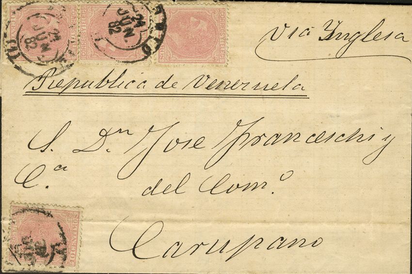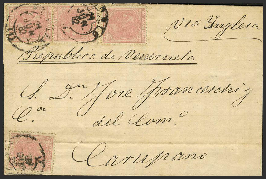 202(4). 1882. 10 cts, cuatro sellos. MADRID a CARUPANO (VENEZUELA). MAGNIFICA E INUSUAL DESTINO.