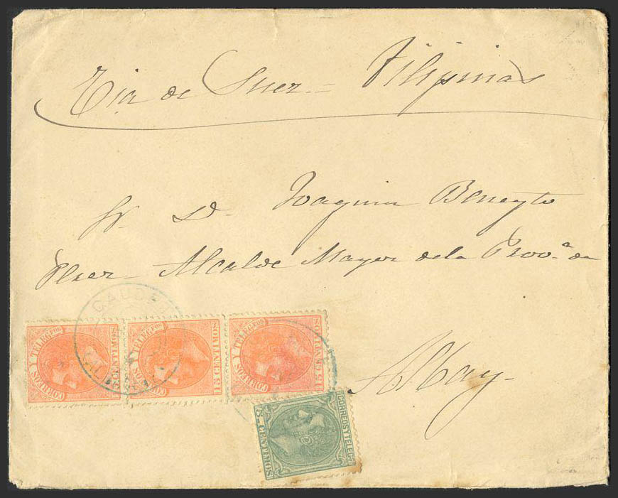 201, 210(3). 1884. 5 cts verde y 15 cts naranja, tira de tres. CAUDETE a ALBAY (FILIPINAS). MAGNIFICA Y RARO DESTINO.