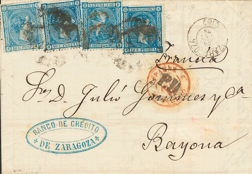 164(4). 1875. 10 cts azul, cuatro sellos. ZARAGOZA a BAYONA (FRANCIA). MAGNIFICA E INUSUAL FRANQUEO, PARA COMPONER LA TARIFA DE 40 CTS.