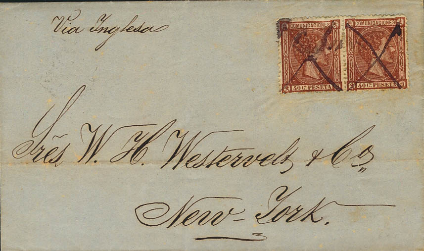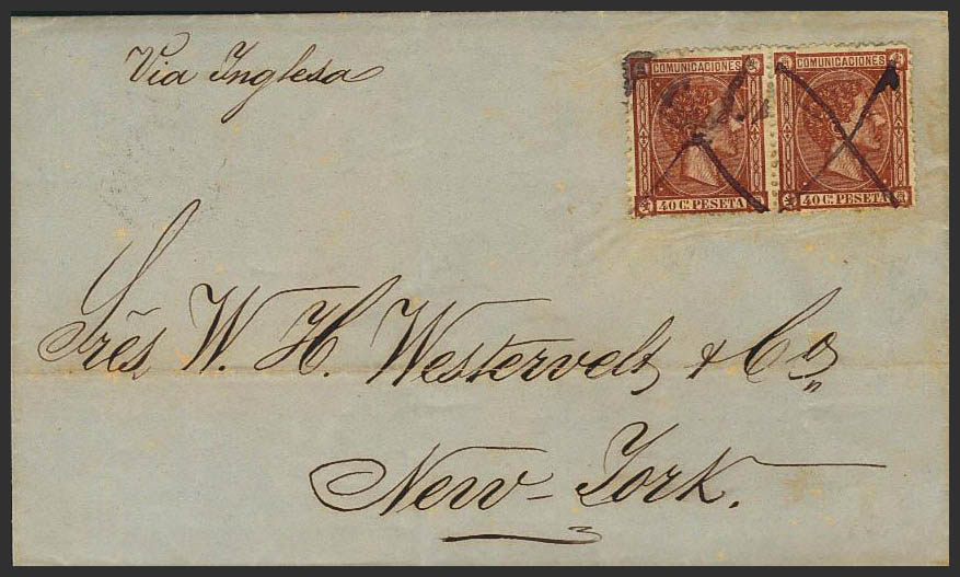 167(2). 1876. 40 cts castaño, pareja. MALAGA a NUEVA YORK (USA). Inutilizados a pluma. MAGNIFICA E INUSUAL DOBLE PORTE.
