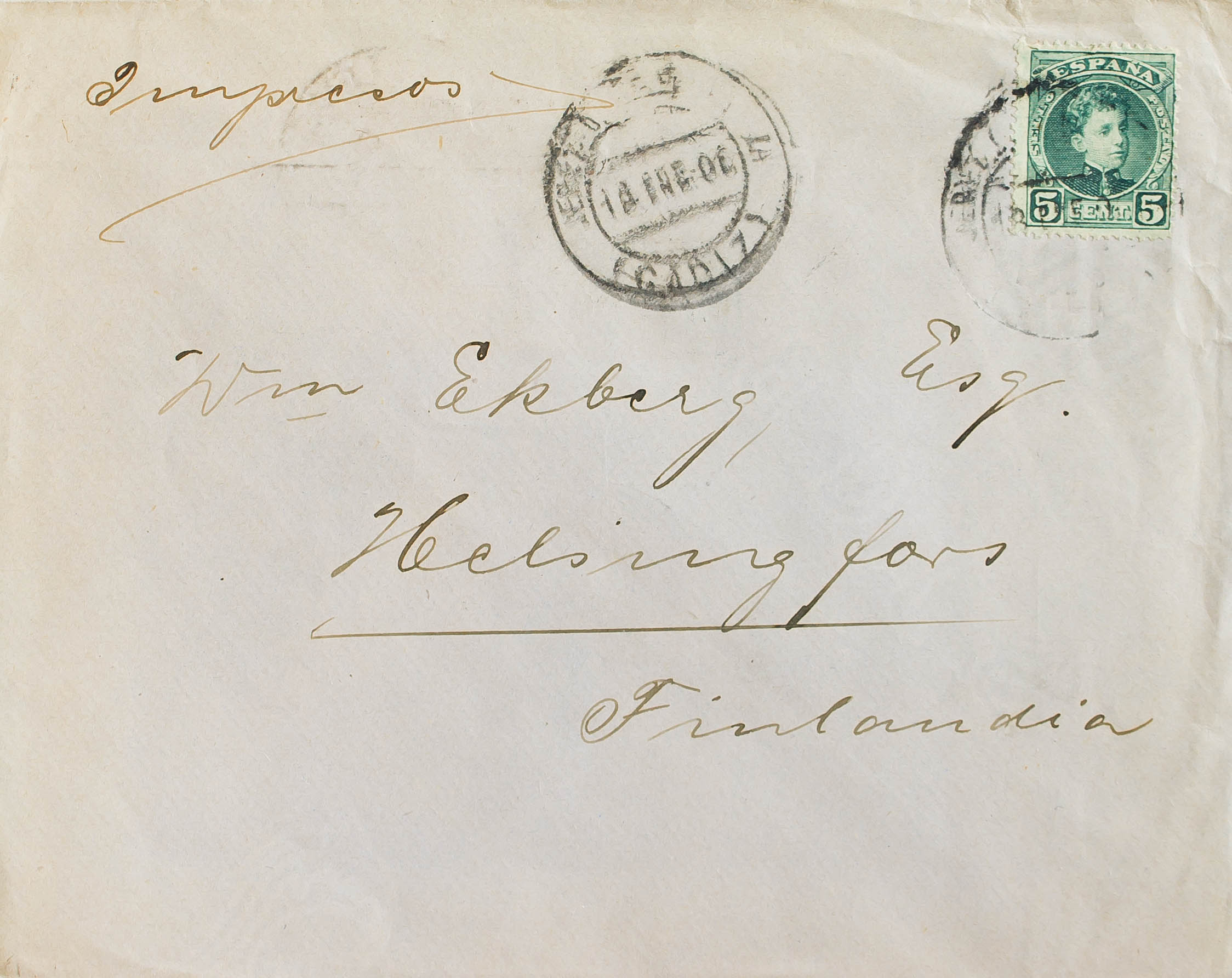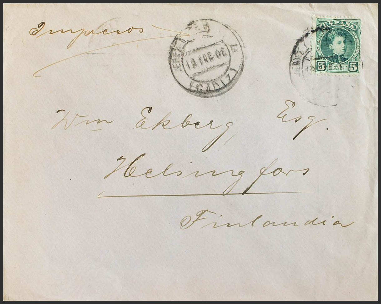 Alfonso XIII. Impreso de JEREZ a FINLANDIA. Al dorso llegada. MAGNIFICA.