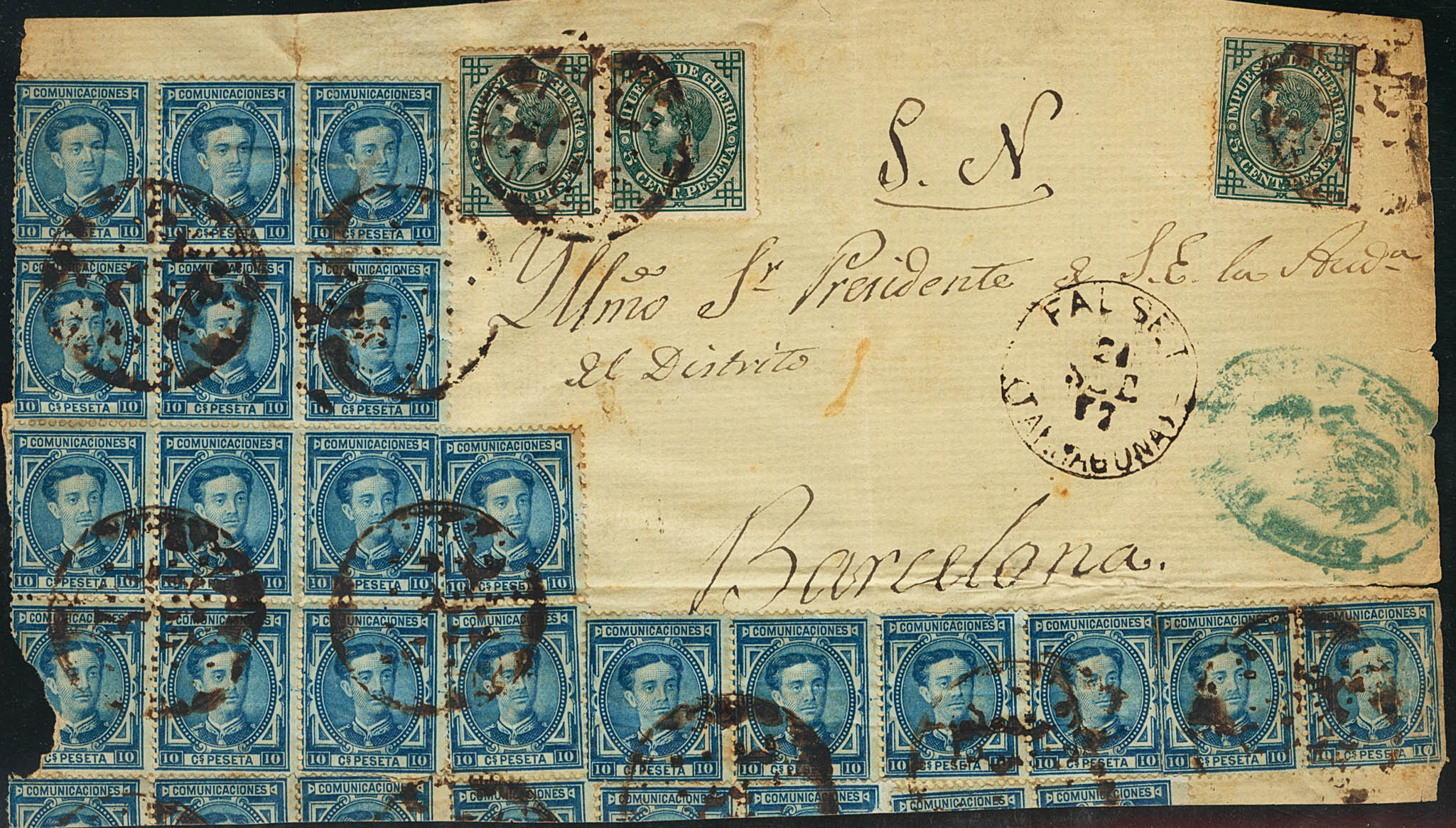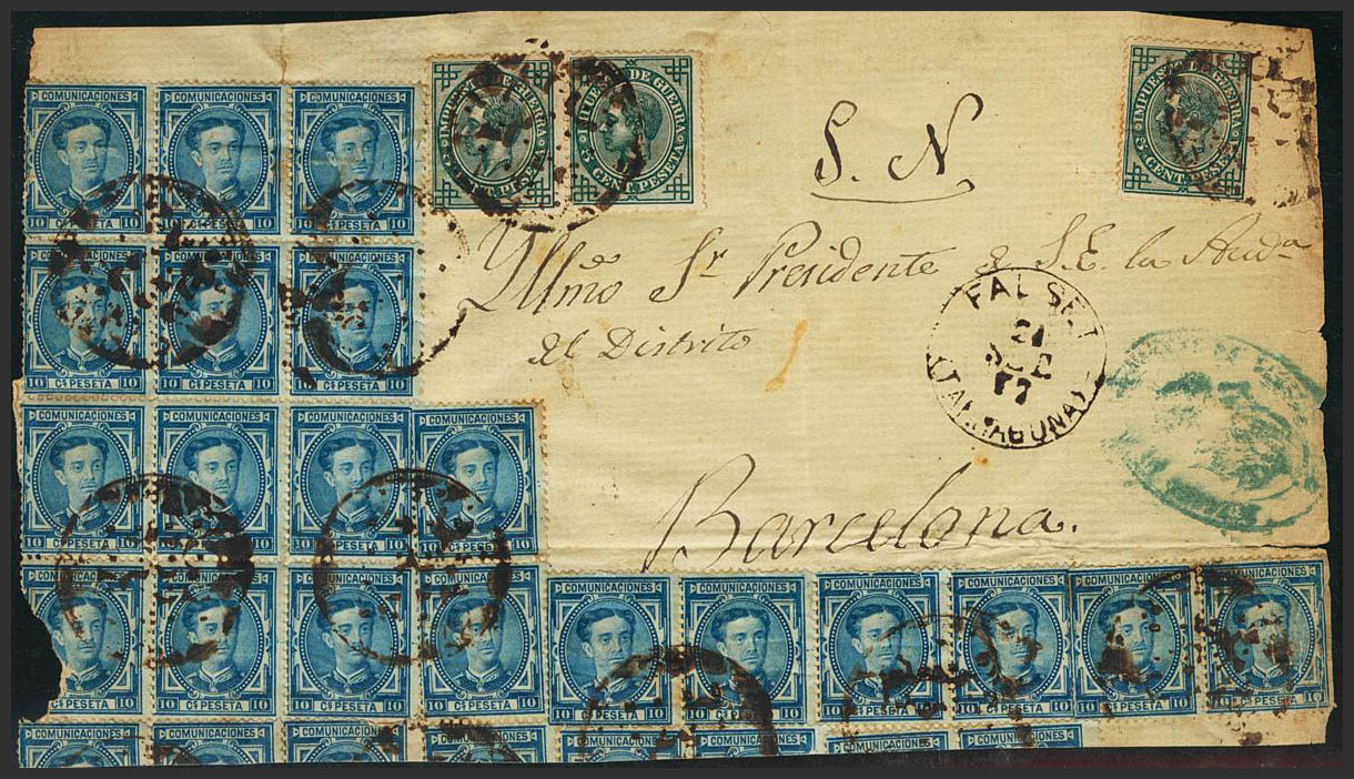 △ 175(20), 183(3). 1877. 10 cts azul, veinte sellos y 5 cts verde, tres sellos de Impuesto de Guerra. Fragmento de Plica Judicial de FALSET a BARCELONA (presenta algunos defectos). BONITO.