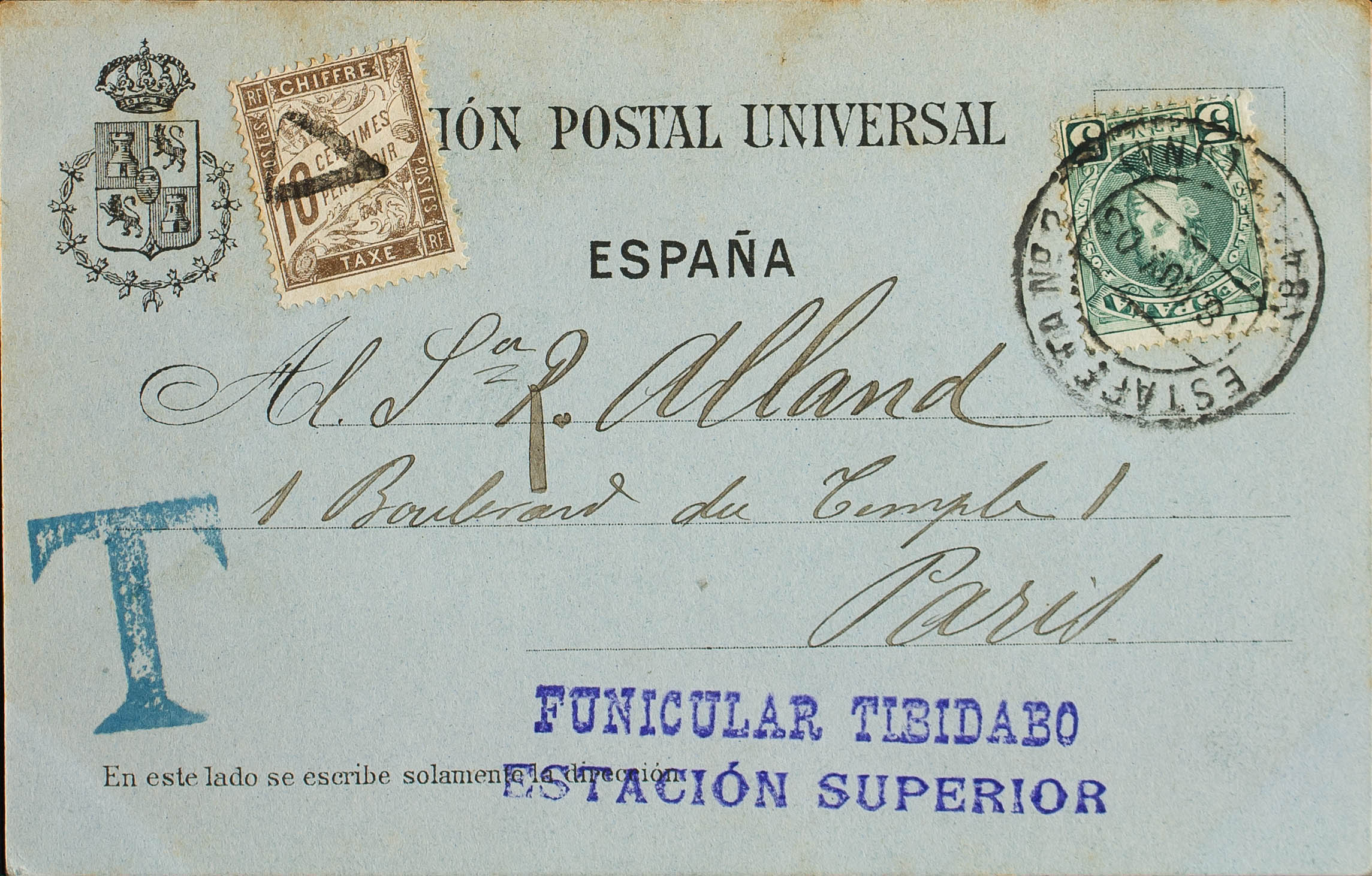 242. 1903. 5 cts verde y 10 cts TASA FRANCESA. Tarjeta Postal del FUNICULAR TIBIDABO (ESTACION SUPERIOR) a PARIS. MAGNIFICA Y RARISIMA.