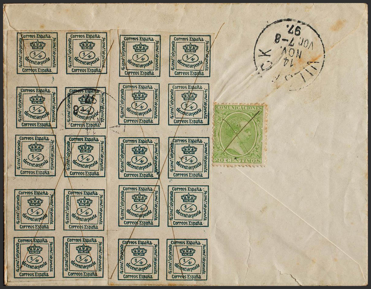 220, 173(4). 1897. 20 cts verde amarillo y 4 cuartos verde, cuatro sellos, franqueados al dorso. BARCELONA a VILSECK (ALEMANIA). En el frente manuscrito "Por vía de Port Vendres, Lyon" y sellos inutilizados a pluma. MAGNIFICA.