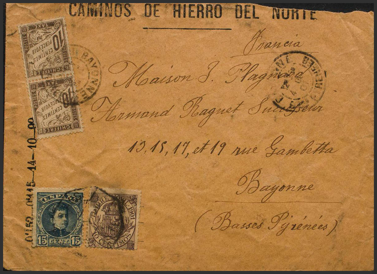 244. 1901. 15 cts azul y Timbre Móvil de 10 cts castaño violeta. Dirigida a BAYONA (FRANCIA). Tasada a la llegada, aplicando dos sellos de tasas de 10 cts castaño. MAGNIFICA Y RARO FRANQUEO.