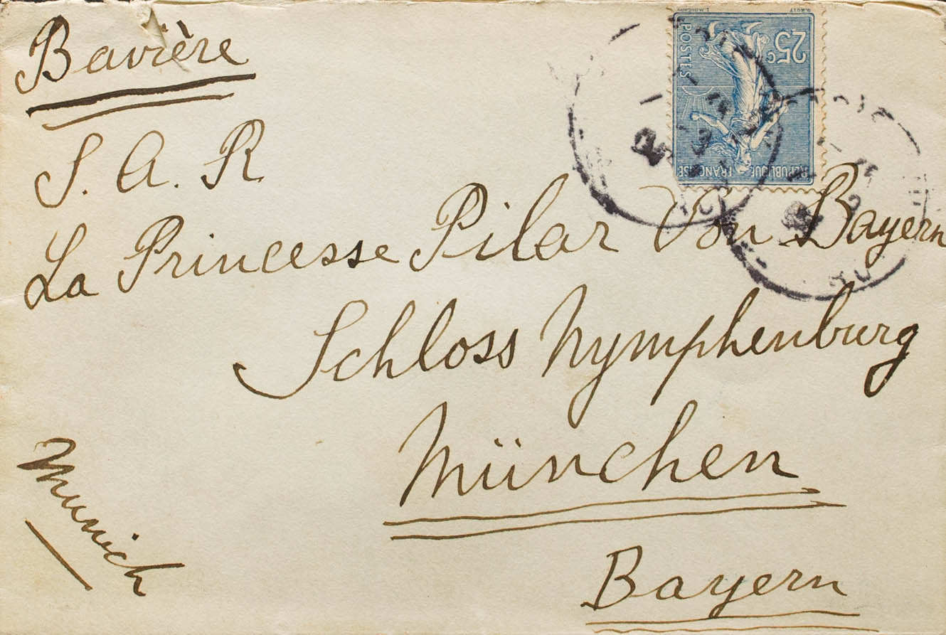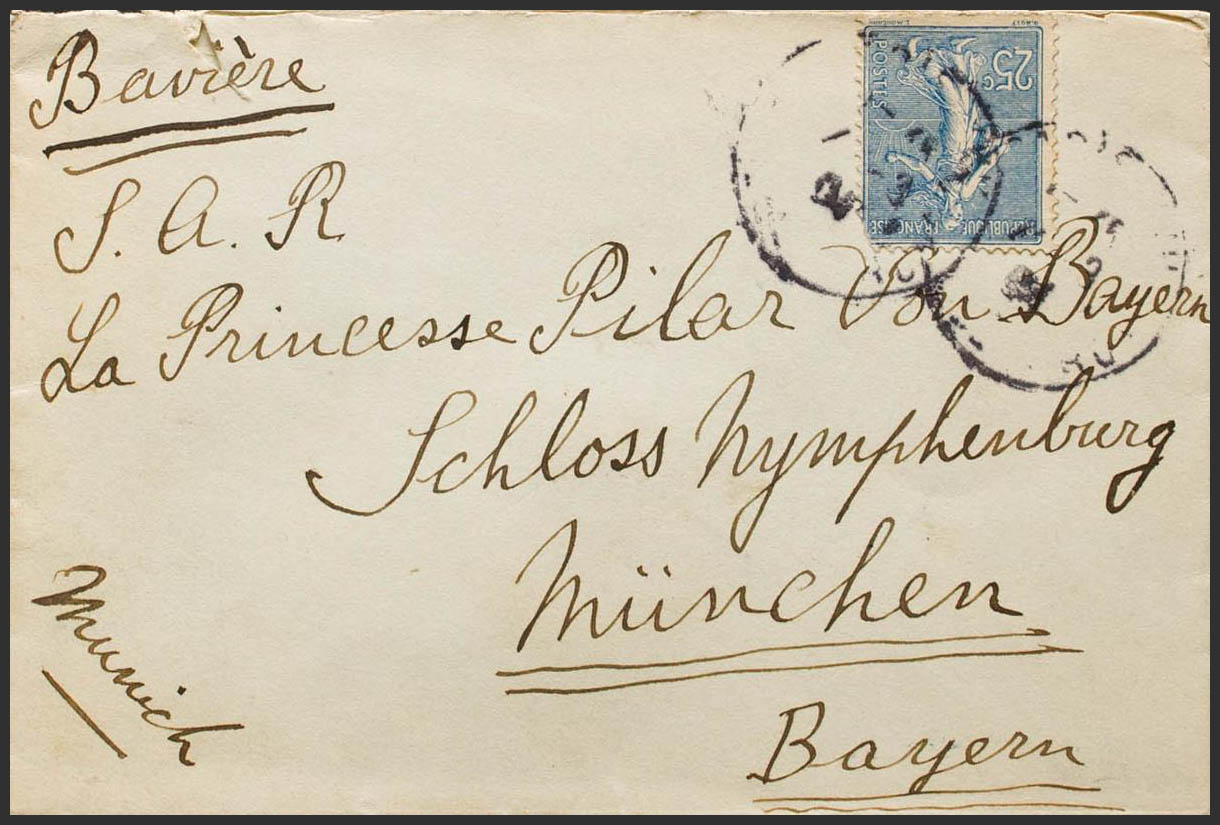 Yvert 132. 1928. 25 cts azul. Dirigida a MUNICH (ALEMANIA), remitida por el Infante Luis Fernando de Baviera (Príncipe de Baviera e Infante de España) a su hija, la Princesa Pilar de Baviera. Al dorso llegada. MAGNIFICA.
