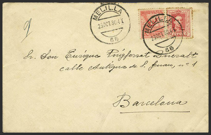 317A, 454. 1930. 20 cts. y 25 cts. MELILLA a BARCELONA. Matasello MELILLA / 66, al dorso. MAGNIFICA.