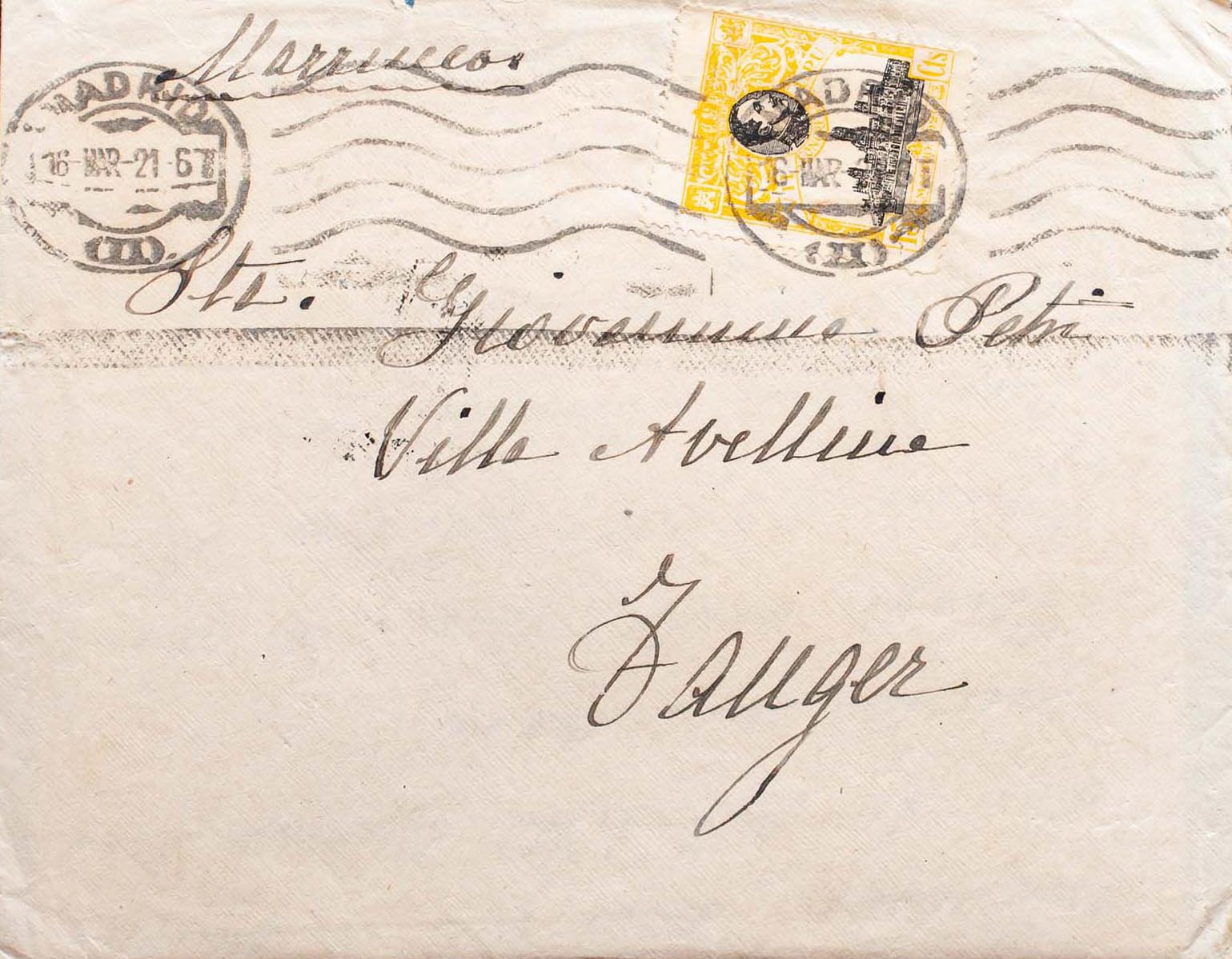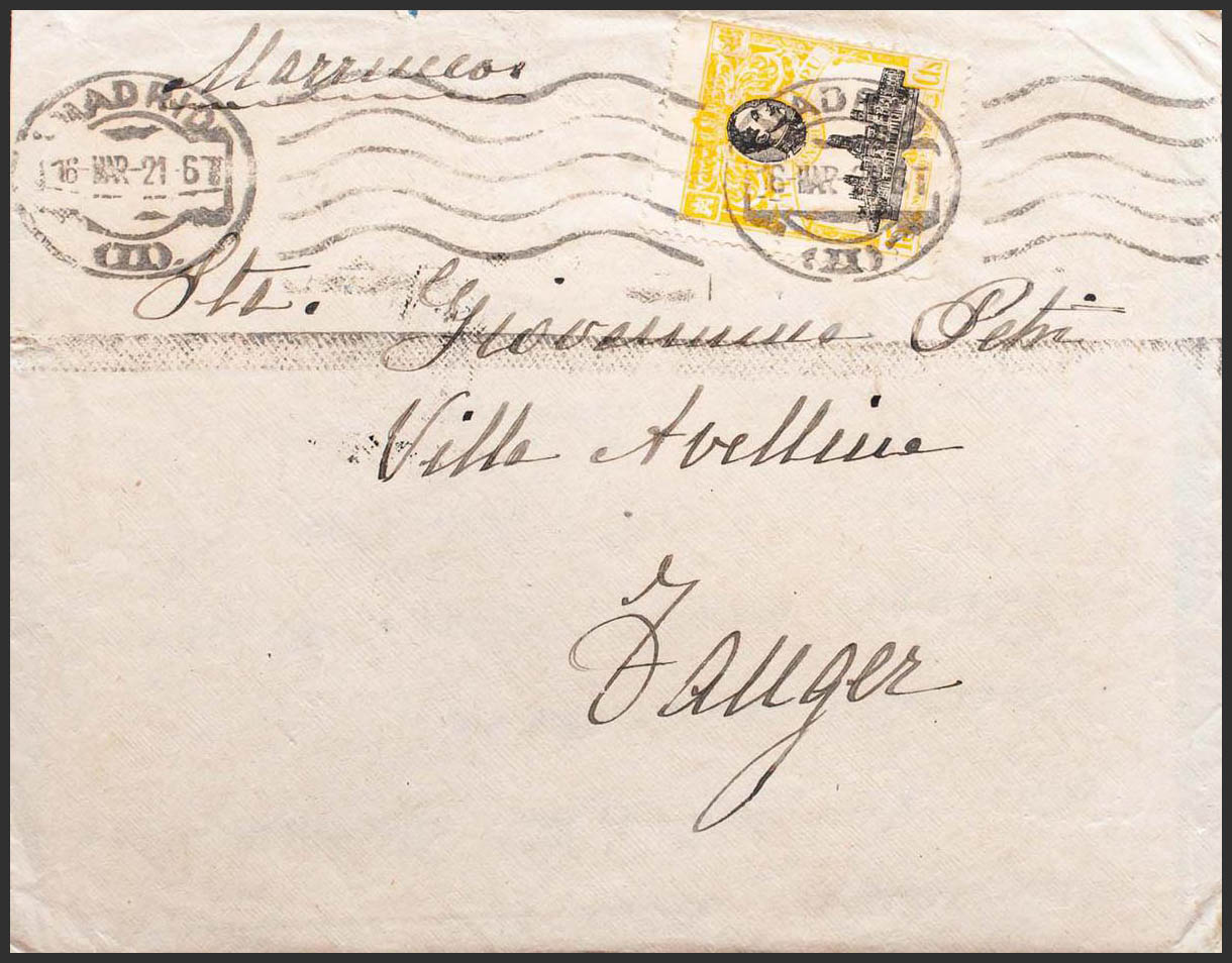 301. 1921. 15 cts amarillo y negro. MADRID a TANGER (MARRUECOS). Al dorso llegada. MAGNIFICA E INUSUAL DESTINO.