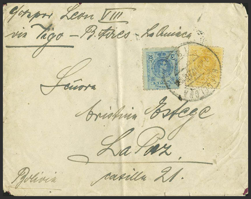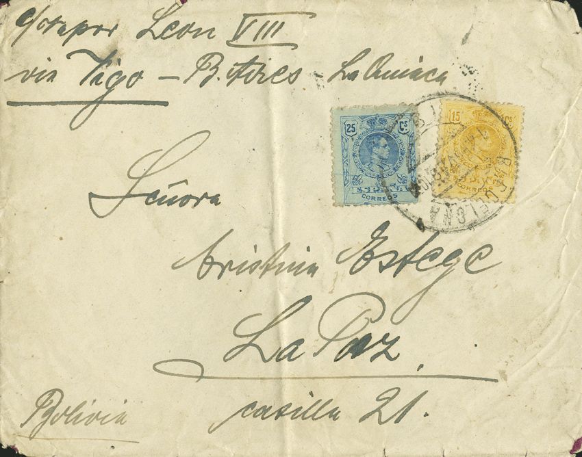 Alfonso XIII. Dirigida a Bolivia. RARA.