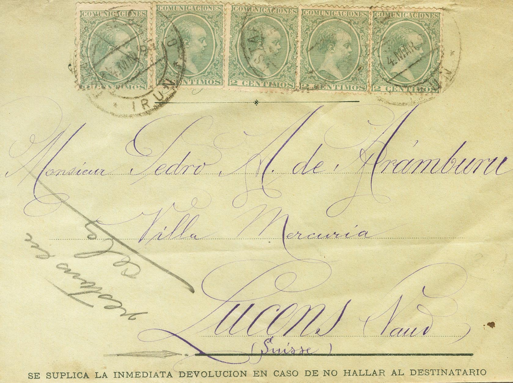 213(5). 1897. 2 cts verde, cinco sellos. IRUN a LUCENS (SUIZA). Matasello ESTAFETA DE CAMBIO / IRUN. MAGNIFICA E INUSUAL FRANQUEO.
