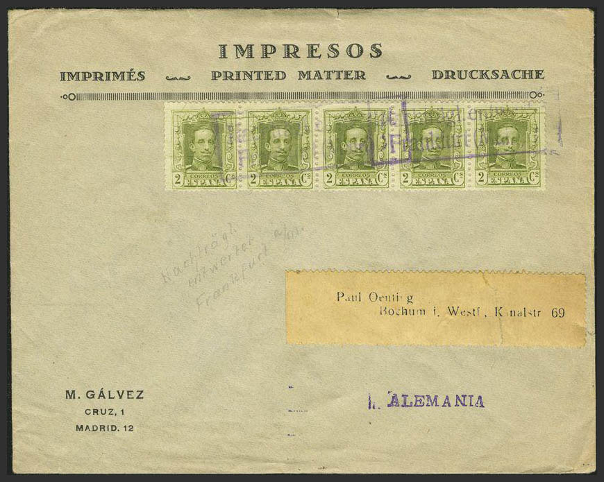 310(5). (1922ca). 2 cts verde, tira de cinco. MADRID a ALEMANIA. Matasello ALEMAN. MAGNIFICO Y RARO.