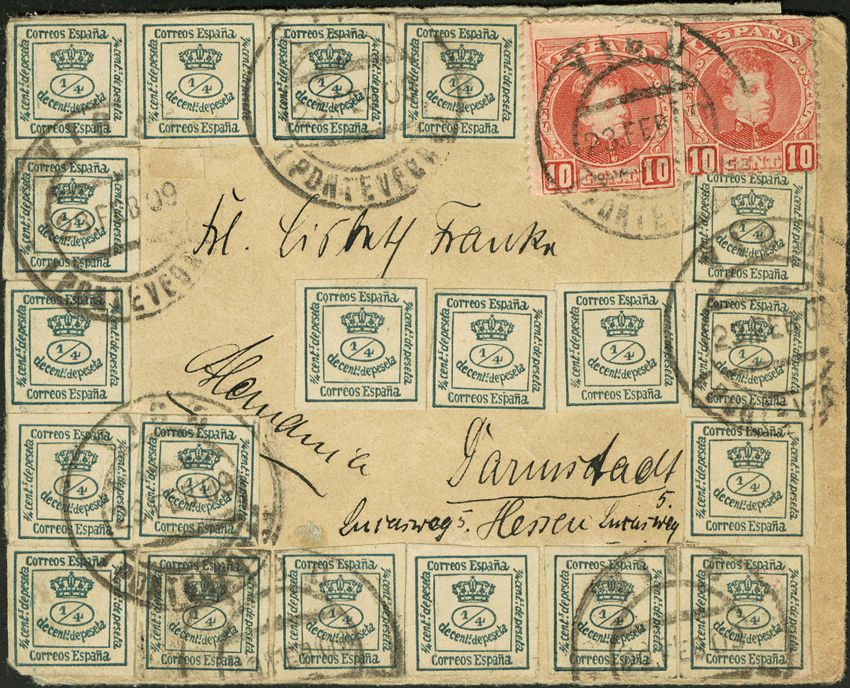 173(5), 243(2). 1909. 10 cts dos sellos y 1/4 cts veinte sellos. VIGO a ALEMANIA. Tarifa de 25 cts. MAGNIFICA.