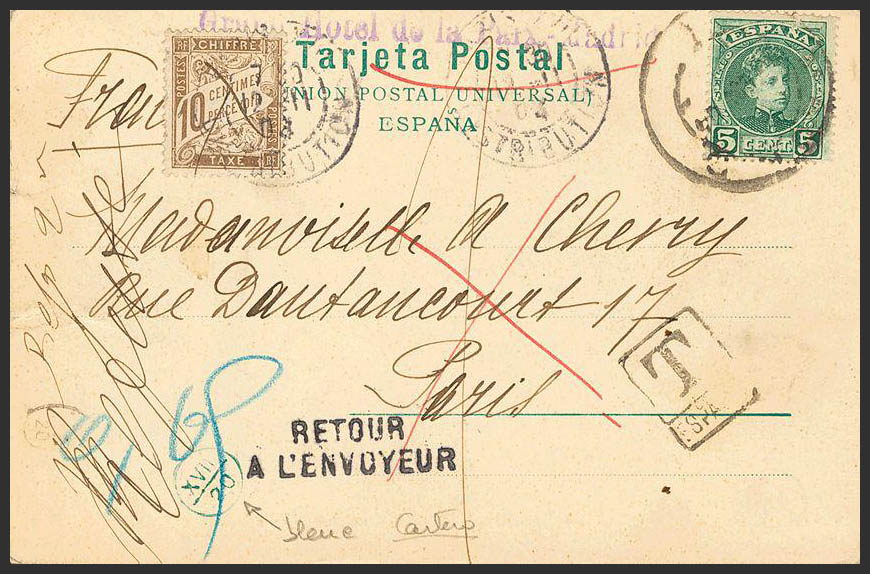 242. 1904. 5 cts y 10 cts TASA FRANCESA. MADRID a PARIS y devuelta a su origen por dirección incorrecta. MAGNIFICA Y RARA.