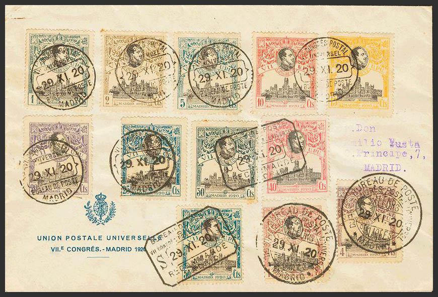 297/08. 1920. Serie completa, a excepción del 10 pts. Carta filatélica con origen en la ESTAFETA DEL CONGRESO a MADRID. MAGNIFICA Y MUY RARA.