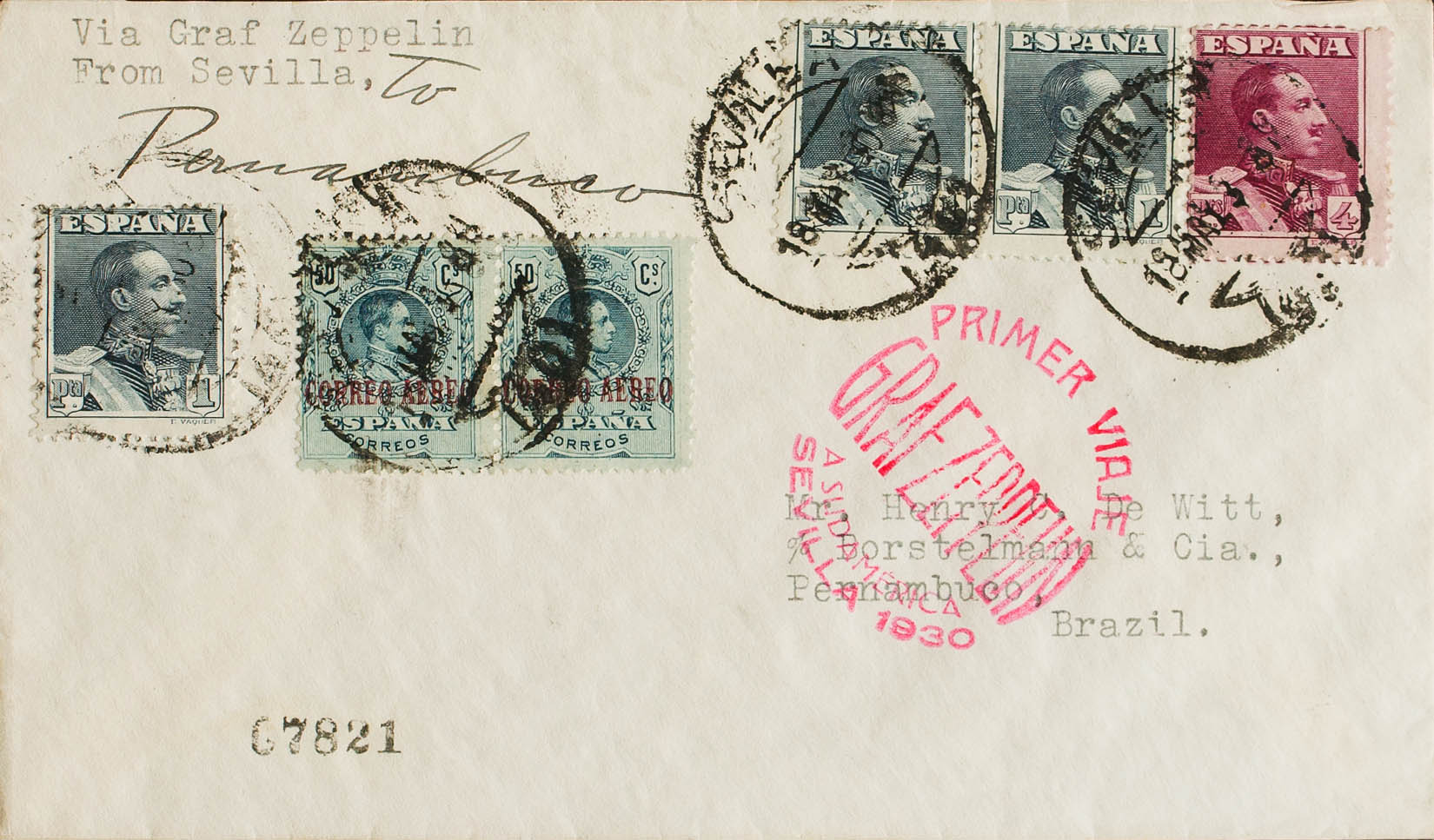321(3), 322, 295(2). 1930. 1 pts pizarra, tres sellos, 4 pts carmín lila y 50 cts azul verdoso, dos sellos. Graf Zeppelin de SEVILLA a PERNAMBUCO (BRASIL). En el frente marca PRIMER VIAJE / GRAF ZEPPELIN / A SUDAMERICA, en rojo y al dorso llegada. MAGNIFICA.