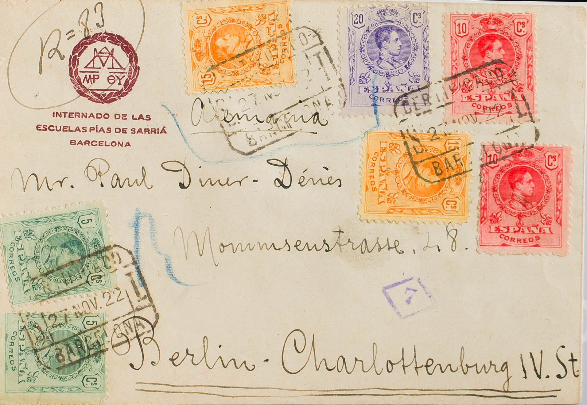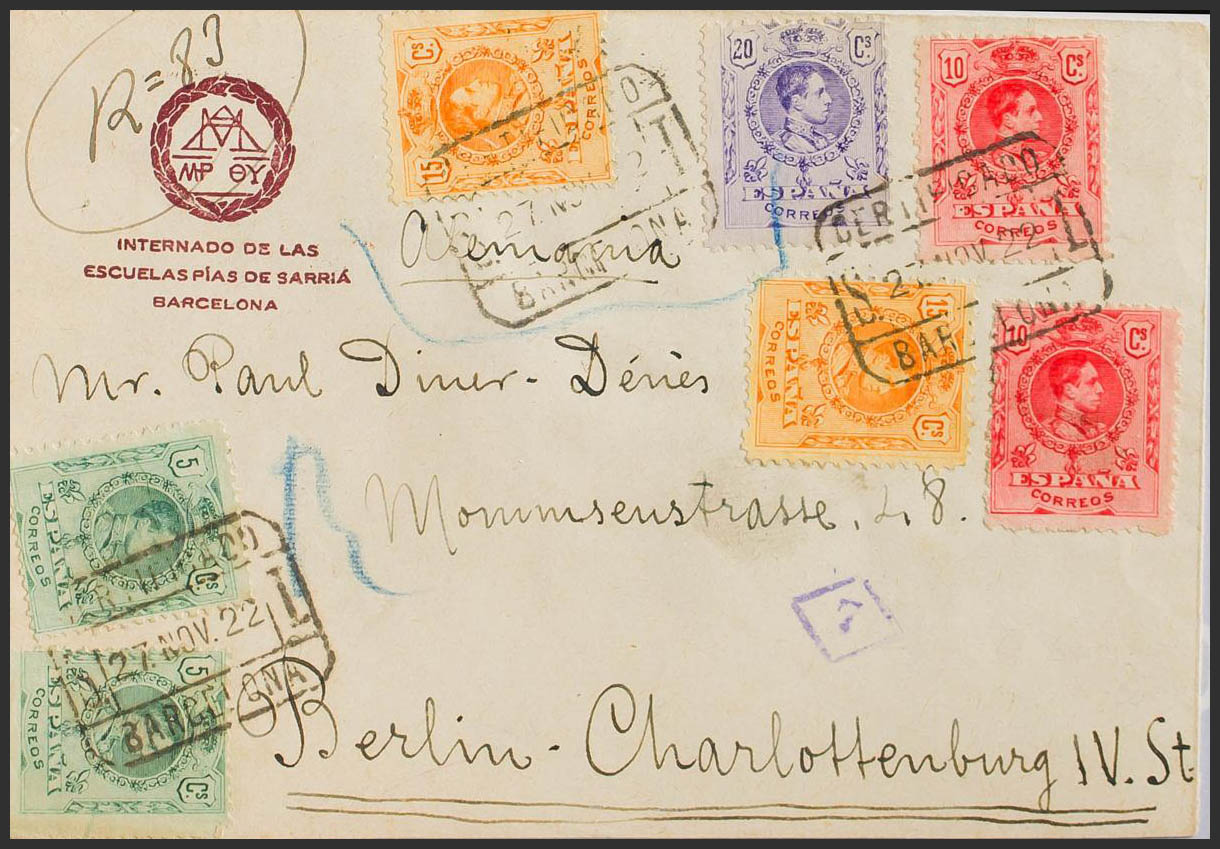 268(2), 269(2), 271(2), 273. 1922. 5 cts verde, dos sellos, 10 cts rojo, dos sellos, 15 cts amarillo, dos sellos y 20 cts violeta. Certificado de BARCELONA a BERLIN (ALEMANIA). Al dorso llegada. MAGNIFICA Y ESPECTACULAR FRANQUEO.