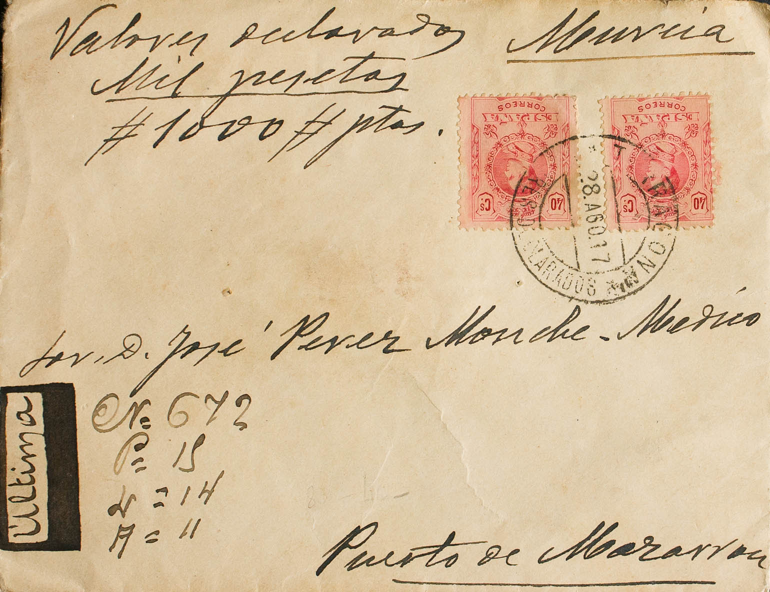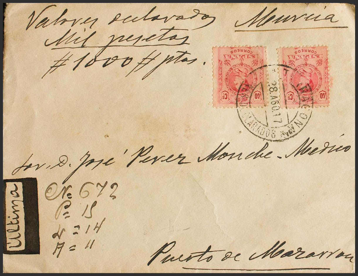 276(2). 1917. 40 cts carmín, dos sellos. Valores Declarados de TARRAGONA a PUERTO DE MAZARRON. Al dorso llegada. MAGNIFICA Y RARA.