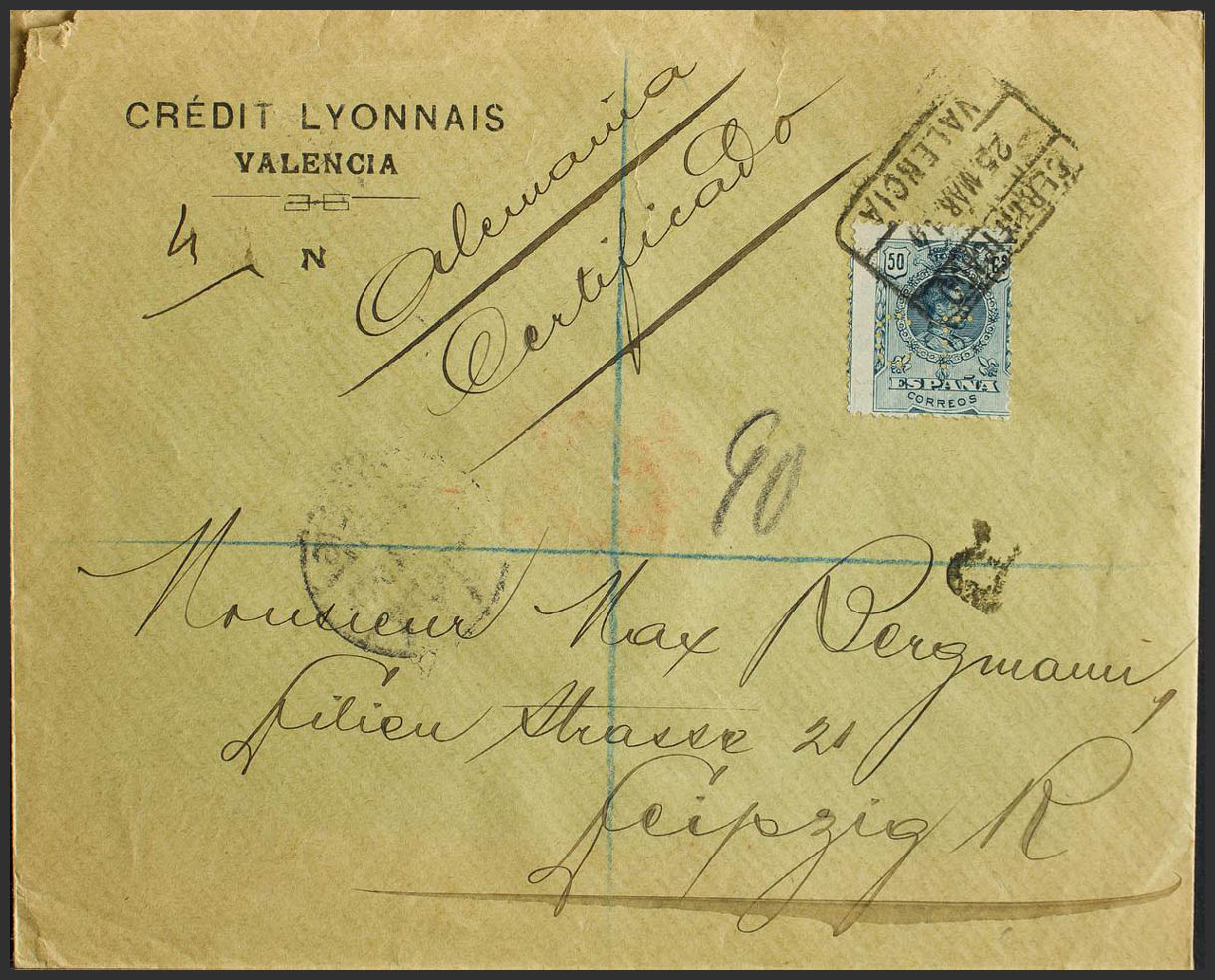 277. 1914. 50 cts azul, perforado CT. Certificado de VALENCIA a LEIPZIG (ALEMANIA). Al dorso llegada. MAGNIFICA.