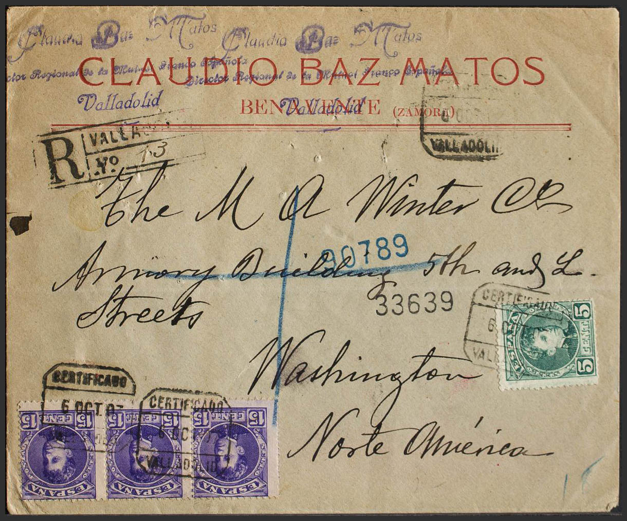 242, 246(3). 1907. 5 cts verde y 15 cts violeta, tres sellos. Certificado de VALLADOLID a WASHINGTON (U.S.A.). Al dorso llegada. MAGNIFICA Y ESPECTACULAR.