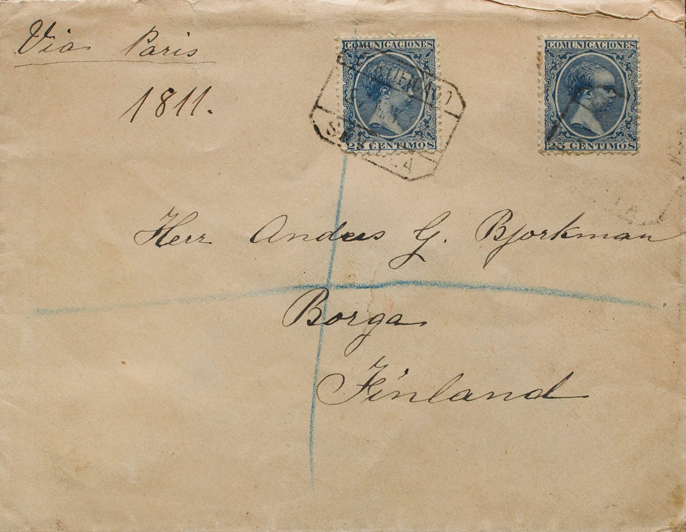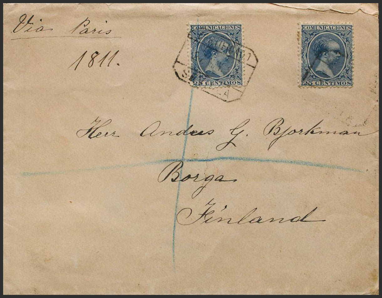 221(2). 1892. 25 cts azul, dos sellos. Certificado de SEVILLA a BORGA (FINLANDIA). Al dorso llegada. MAGNIFICA Y RARISIMO DESTINO.