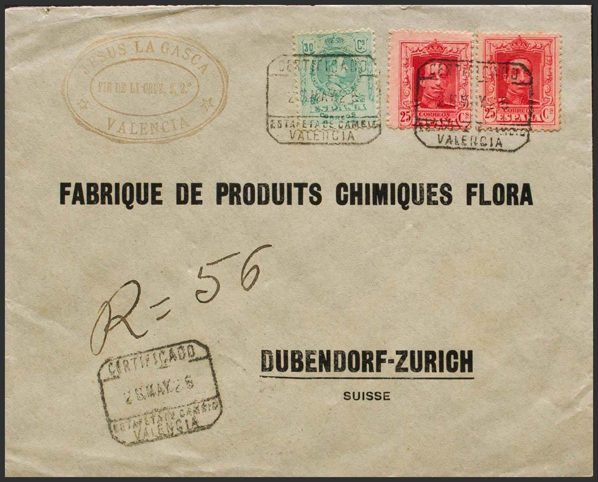 317(2), 275. 1905. 25 cts carmín, dos sellos y 30 cts verde de Medallón. Certificado de VALENCIA a ZURICH (SUIZA). Al dorso llegada. MAGNIFICA E INUSUAL COMBINACION DE DIFERENTES EMISIONES.