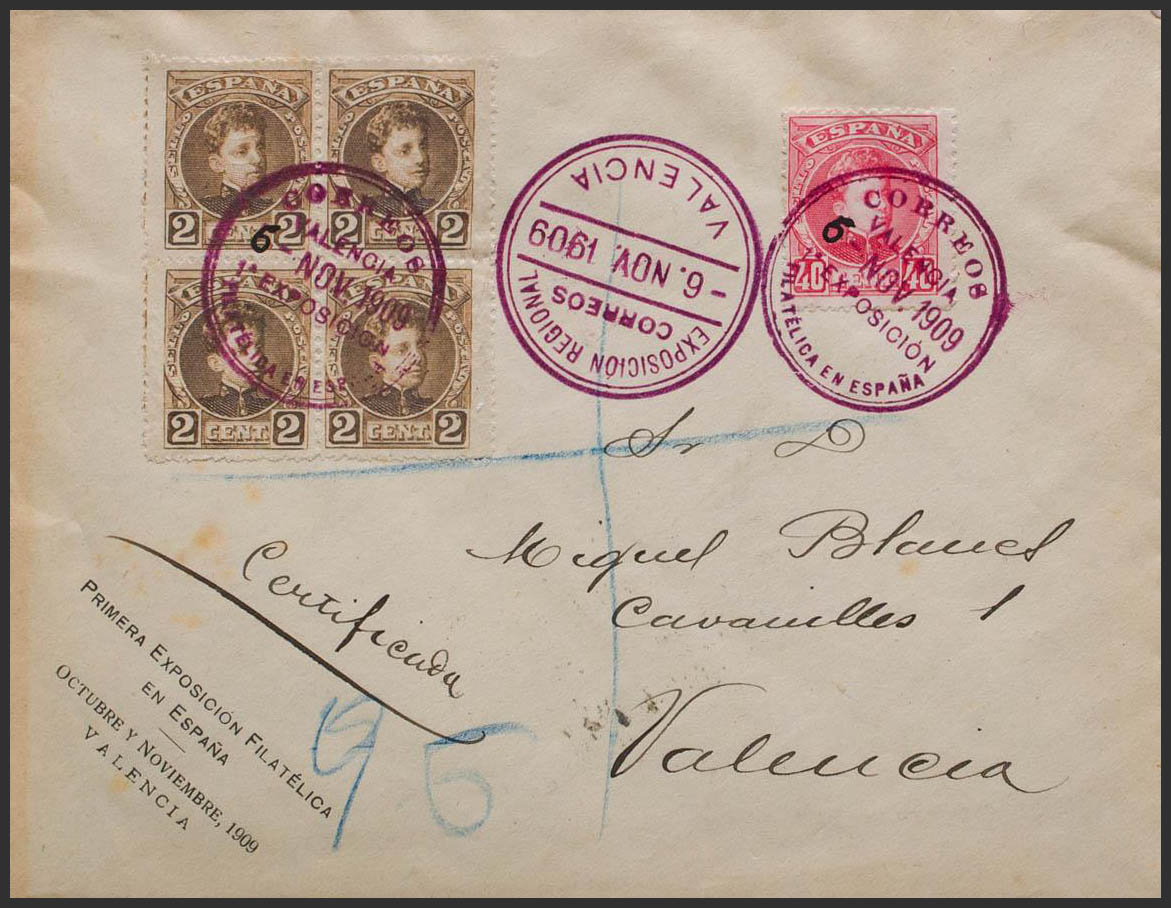 251, 241(4). 1909. 40 cts rosa y 2 cts sepia, cuatro sellos. Correo Interior de VALENCIA. Matasello EXPOSICION REGIONAL / CORREOS / VALENCIA, al dorso llegada. MAGNIFICA Y MUY RARO FRANQUEO.