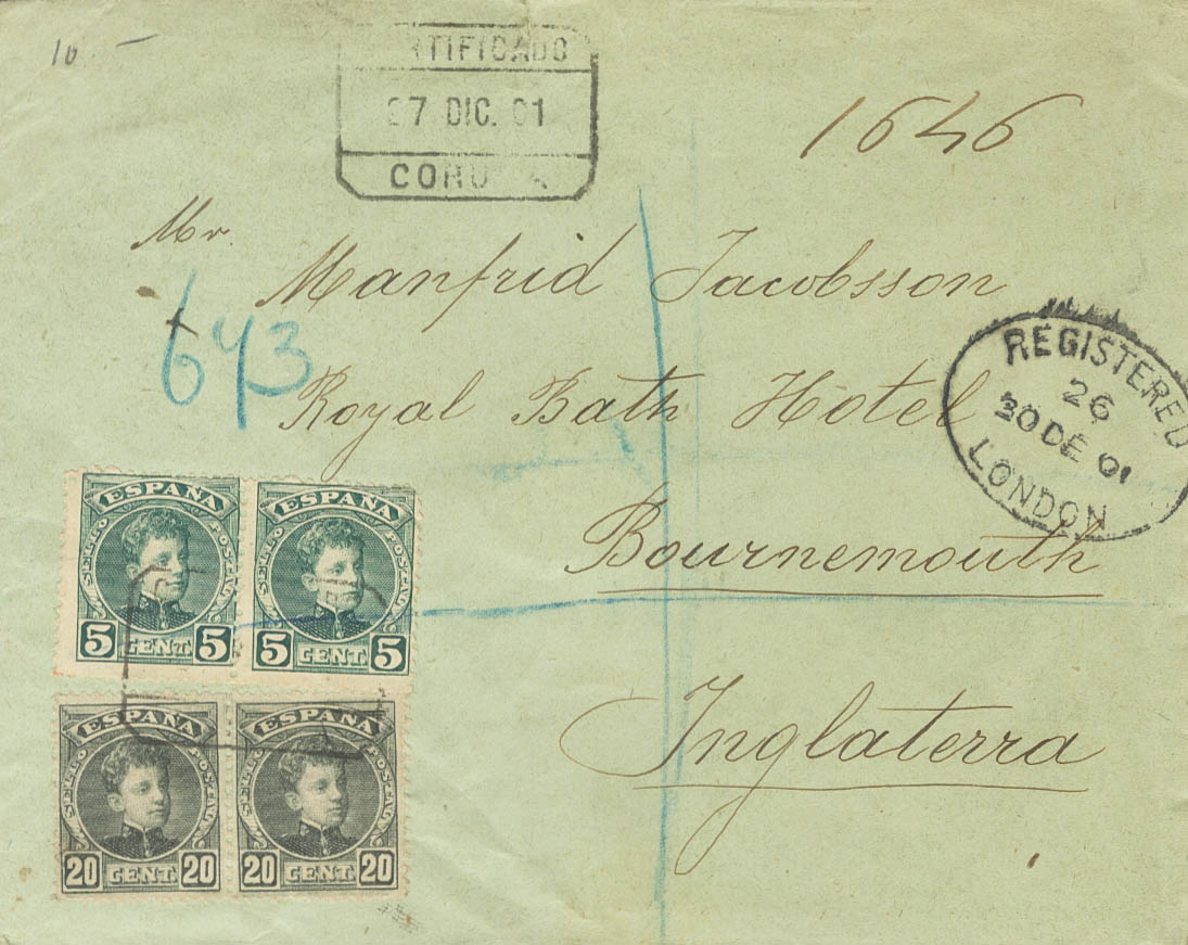 242(2), 247(2). 1926. 5 cts verde, dos sellos y 20 cts negro, dos sellos. Certificado de LA CORUÑA a BOURNEMOUTH (INGLATERRA). En el frente tránsito REGISTERED / LONDON y al dorso llegada. MAGNIFICA Y RARA.