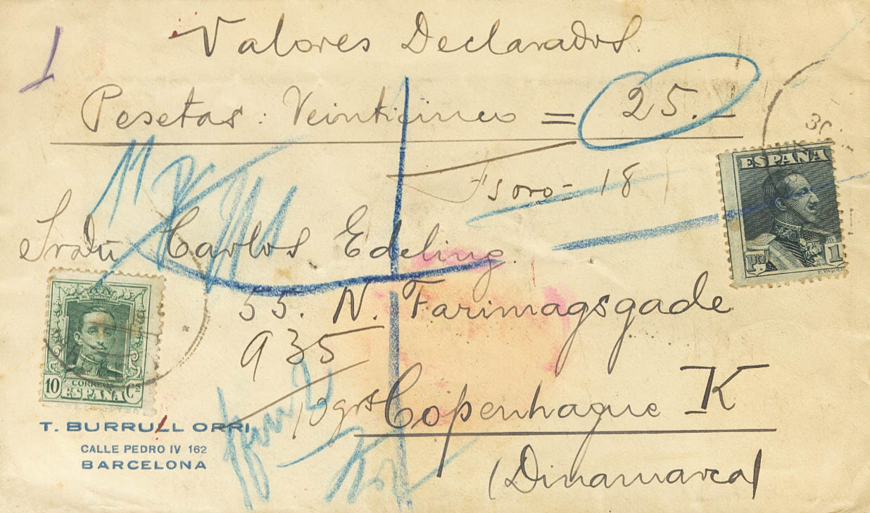 314, 321. 1925. 10 cts verde y 1 pts pizarra. Valores Declarados de BARCELONA a COPENHAGUE (DINAMARCA). Al dorso tránsitos Perpiñán, Karlsruhe y llegada. MAGNIFICA Y RARA.