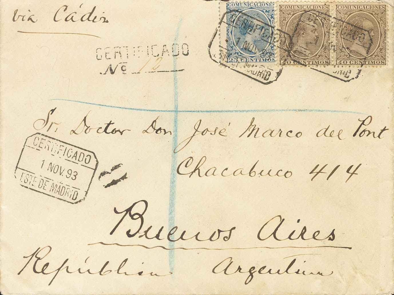 222, 224(2). 1893. 25 cts azul y 40 cts castaño, dos sellos. Certificado de MADRID a BUENOS AIRES (ARGENTINA). Matasello CERTIFICADO / ESTE DE MADRID. MAGNIFICA.