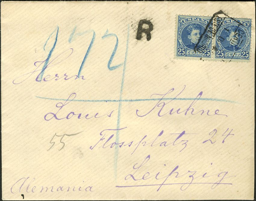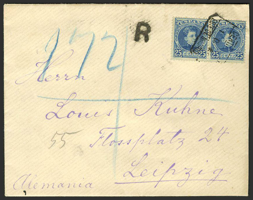 248(2). 1902. 25 cts azul, pareja. MADRID a LEIPZIG(ALEMANIA). Matasello CERTIFICADO / ESTE DE MADRID. MAGNIFICA Y RARA.