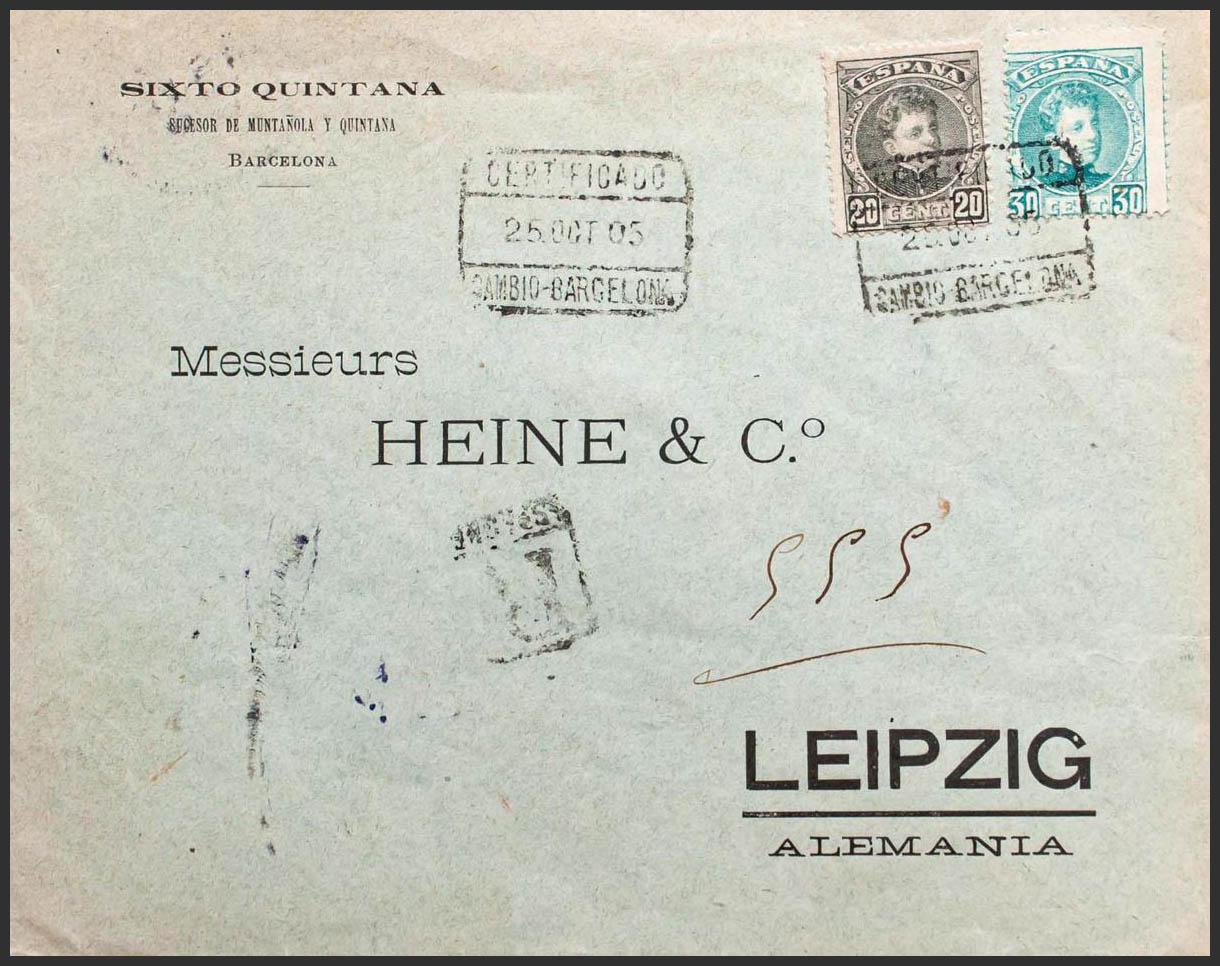 247, 249. 1905. 20 cts negro y 30 cts verde. Certificado de BARCELONA a LEIPZIG (ALEMANIA). Al dorso llegada. MAGNIFICA E INUSUAL COMBINACION DE FRANQUEO.