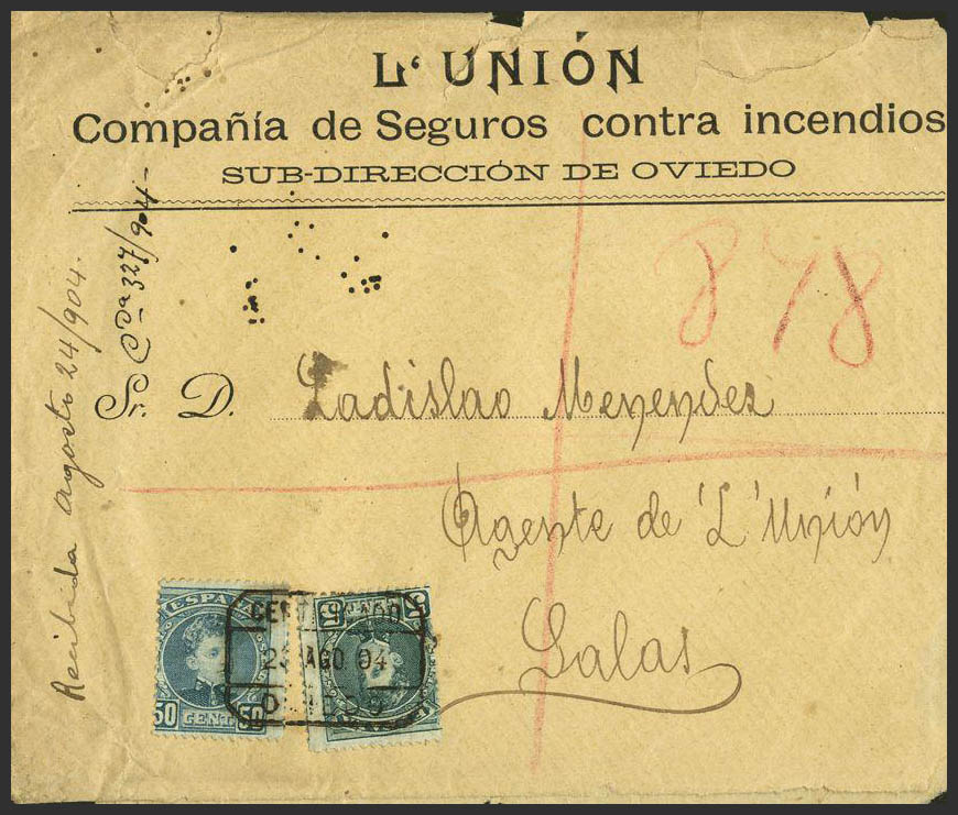 242, 252. 1904. 5 cts. y 50 cts. OVIEDO a SALAS. Matasello CERTIFICADO / OVIEDO. MAGNIFICA.