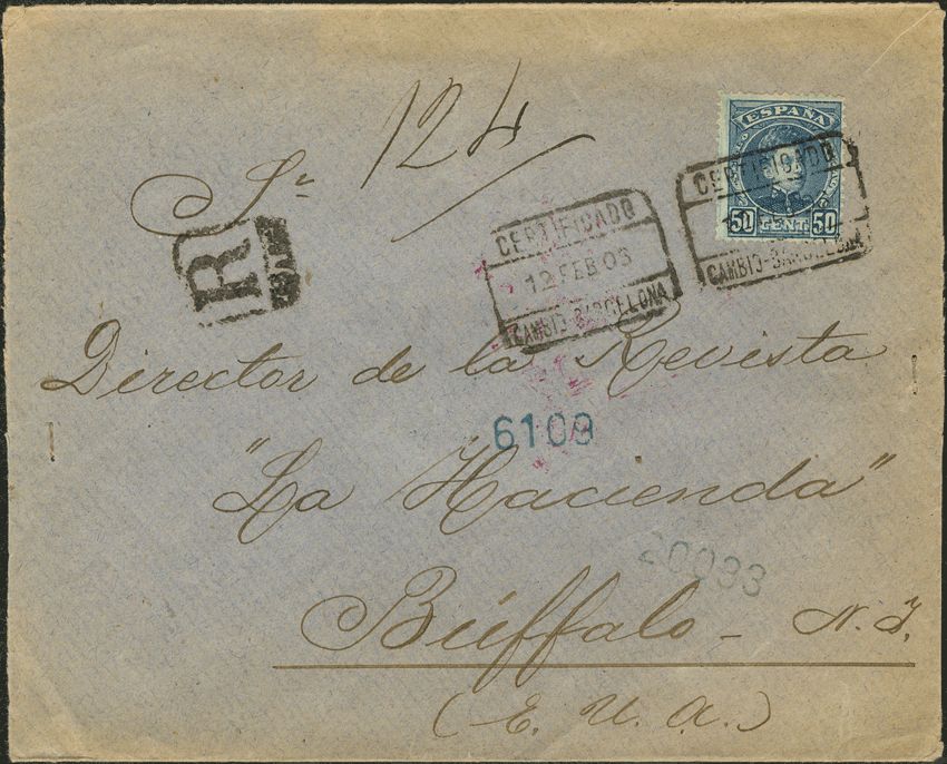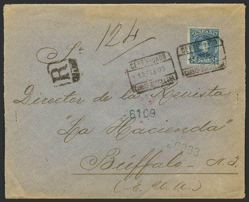 252. 1906. 50 cts verde. Certificado de BARCELONA a BUFFALO (USA). Matasello CERTIFICADO / CAMBIO-BARCELONA. MAGNIFICA.